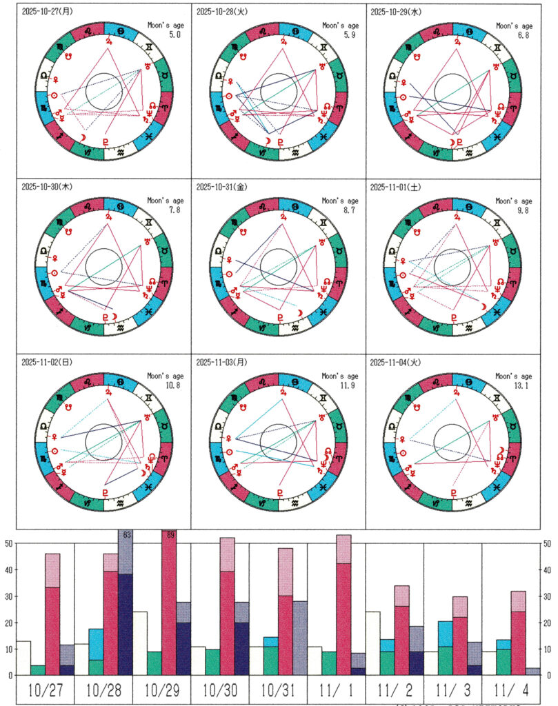 ★1本目の棒グラフが高い日⇒全体的にパワーが高く、星同士の組み合わせで意味が変わる⇒メールマガジン「アストロハーモニック通信」参照
