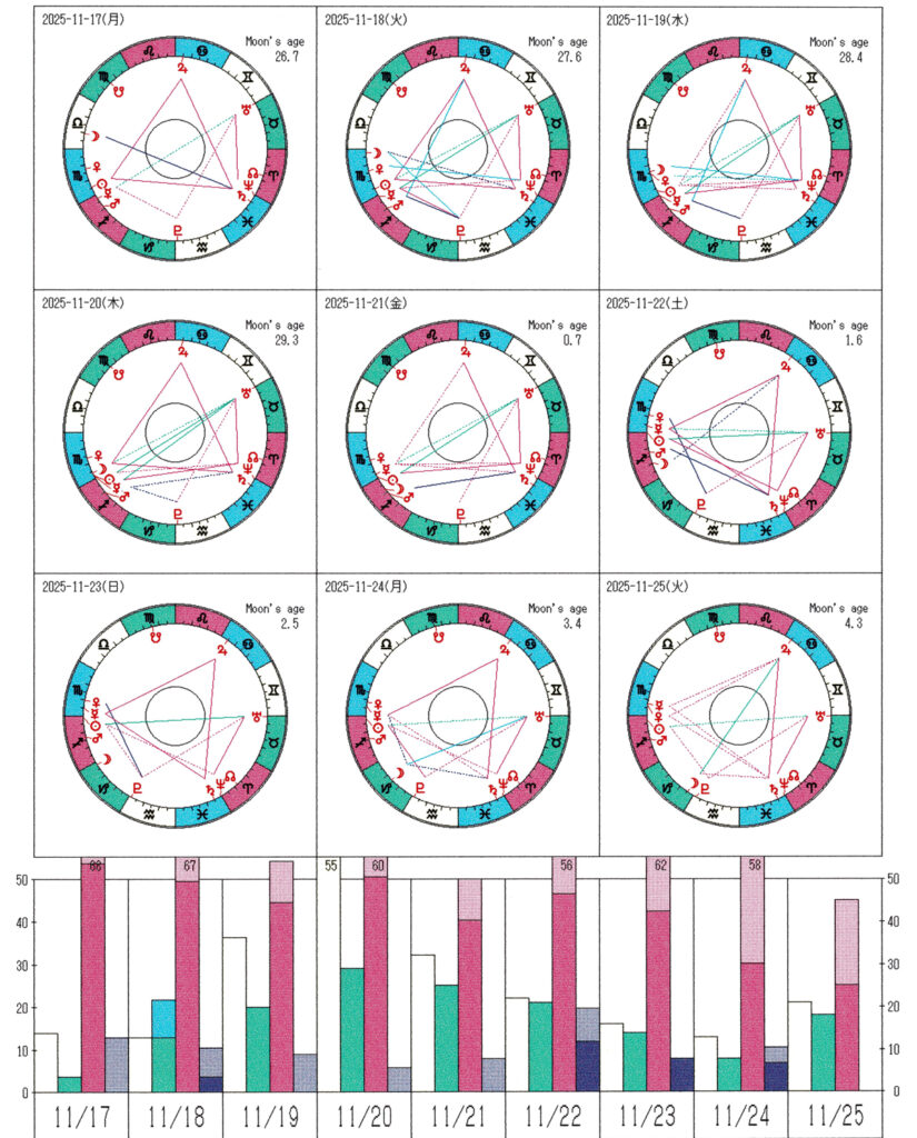 ★1本目の棒グラフが高い日⇒全体的にパワーが高く、星同士の組み合わせで意味が変わる⇒メールマガジン「アストロハーモニック通信」参照