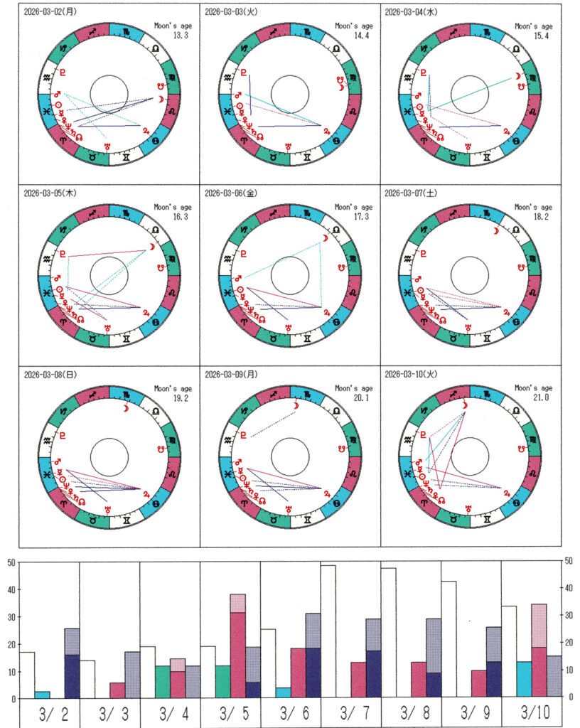 ◎下段にある『棒グラフ』は,下記のような運勢(風向き)を表し、棒グラフの高さは、もう1つの頁「星同士のアスペクト」表から,下の第2段落のような計算で表示されます。