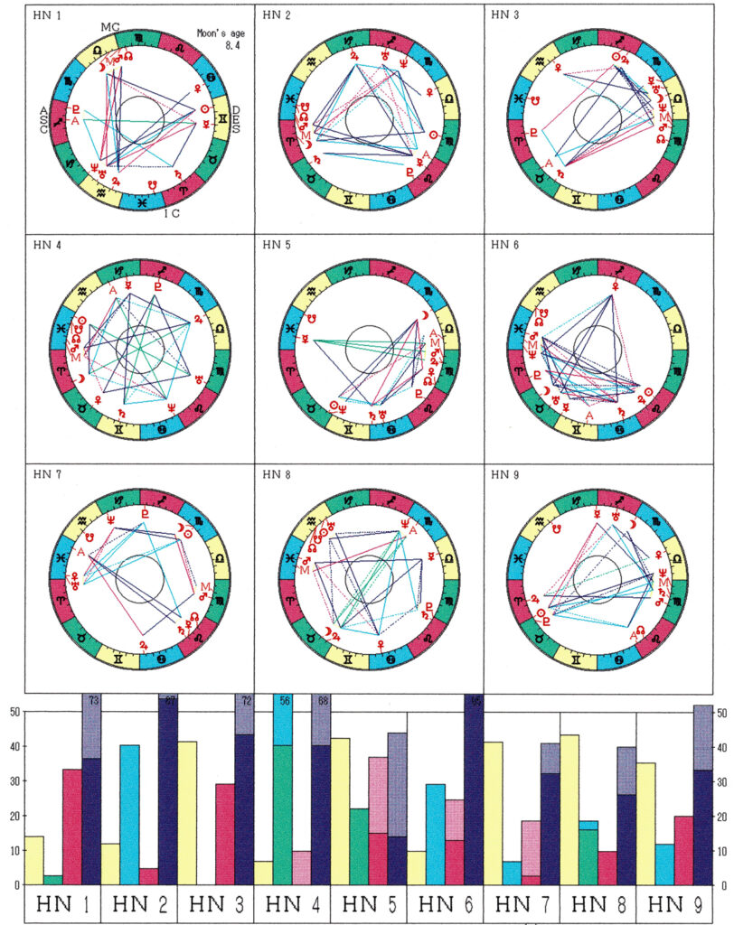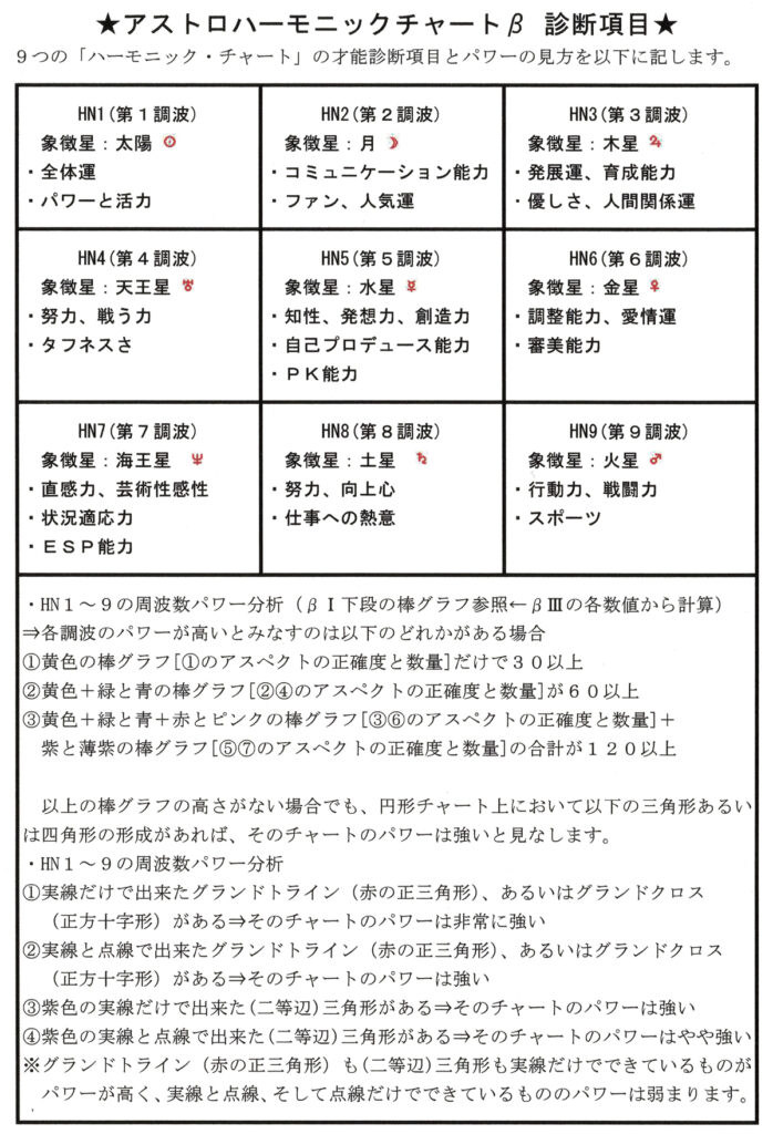 Astro Harmonic Chart β1 of Fujii Kaze 1997年6月14日18:30 岡山県浅口郡里庄町生まれ 上記ハーモニクスチャートの第1調波(ホロスコープ)から第9調波までの診断法です